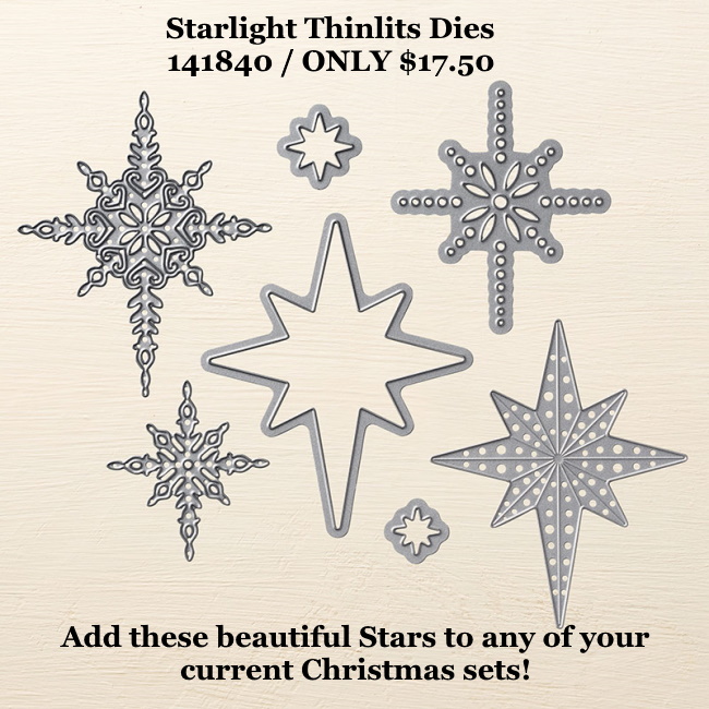I’ve changed up the greetings on these some of the samples so you can picture using them anytime of the year. Let me start with the Starlight Thinlits Dies … anything with “Star” in the name is a pretty sure bet that I’ll be buying it … My Team name is “Stars by Design”!!